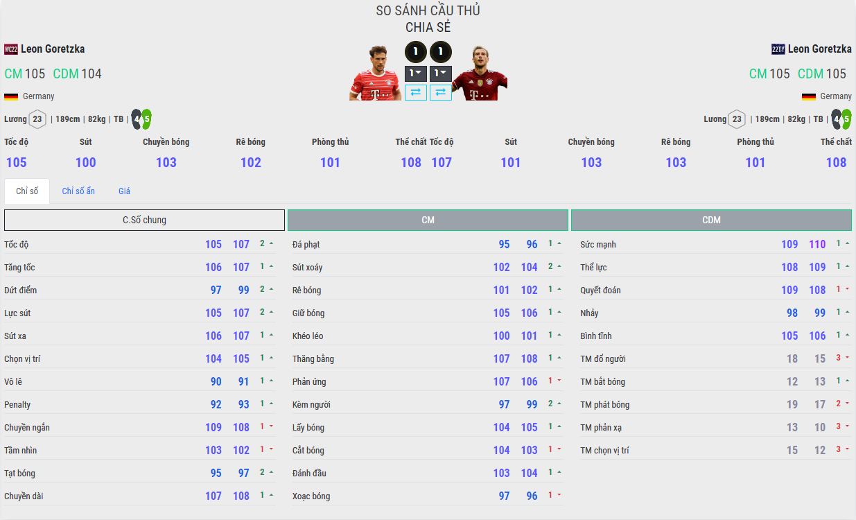 Mùa giải 22TY có chỉ số tốc độ tốt hơn, nhưng thực tế thì nó không được rõ ràng cho lắm khi thi đấu trên sân. Vị trí của Goretzka chủ yếu đá ở CDM và CM, mà hai vị trí này thì ít khi phải đua tốc như các tiền đạo nên cũng rất khó nhận ra sự hơn thua trong các tình huống.