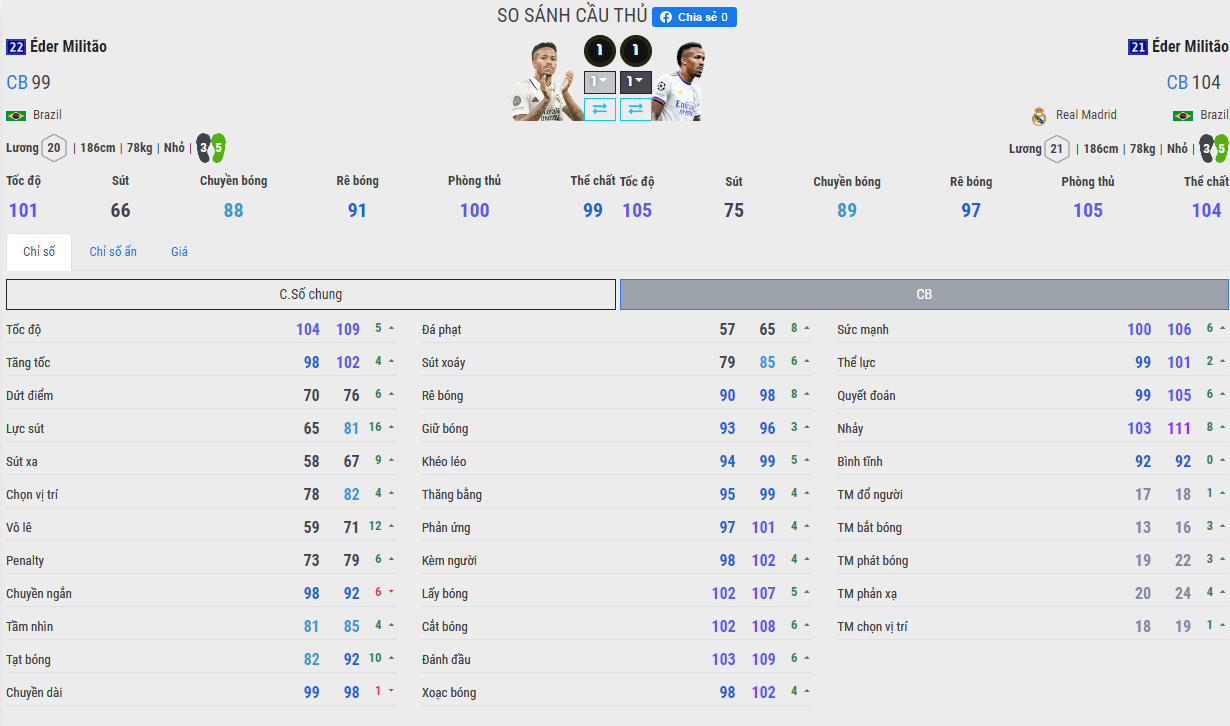 Tuy nhiên Eder Militao là một trong những cầu thủ thi đấu bằng cái tên là chính, chỉ số có thể thấp nhưng AI mà Nexon trao cho anh thì không thể xem thường, chúng ta sẽ cùng xem những so sánh dưới đây để nhìn rõ hơn