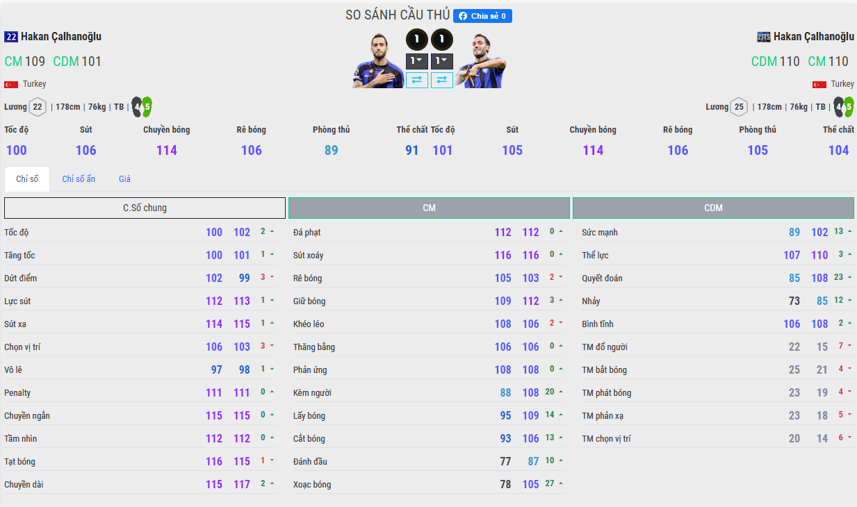 Bạn có thấy là hai cầu thủ này gần như có các thông số về tấn công là giống nhau không ? tương tự như tốc độ thì hai mùa này đều cho chúng ta một Calhanoglu gần như một khuôn đúc ra vậy, việc chơi khá xa khung thành và ít dâng cao nên khả năng ghi bàn không thực sự ấn tượng.