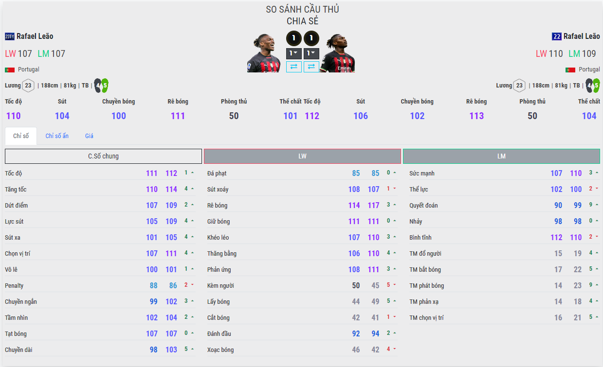 Trong Fo4 thì Leao hiện có hai mùa giải được khá đông các HLV ưa dùng là 23TY và 22UCL, tuy nhiên với việc để thua trong trận bán kết lượt đi trước Inter Milan thì cơ hội để cho cho cầu thủ Ac Milan nói chung và Leao nói riêng sẽ ít đi. Đây cũng là thời điểm chúng ta có thể đưa ra những so sánh tốt nhất cho hai mùa giải của Rafael Leao.