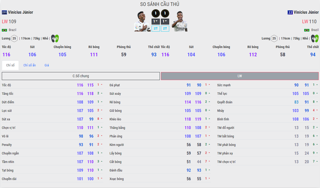 Với những fan của Real Madrid thì đây rõ ràng là một sự bổ sung lực lượng cực mạnh cho hành lang cánh, sau khi Gareth Bale đã giải nghệ, còn Hazard đang ngày một rời xa gameplay của game. Có tới 5 mùa giải của Vinicius Junior đang được người chơi ưa chuộng trong game. Tuy nhiên chúng ta sẽ so sánh hai mùa đang nhận được nhiều sự quan tâm nhất lúc này là 22UCL và 23TY.