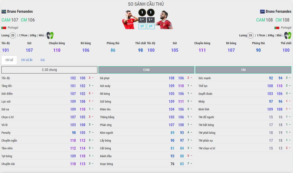 Bruno Fernandes 23TY có chỉ số chuyền tốt hơn nhưng chừng đó chưa đủ tạo ra những sự khác biệt về mặt thực tế trên sân. Tiền về này chưa có những cái thiện về mặt AI so với mùa giải 22TS hay WC22 trước đó. Có chăng là cảm giác khi bạn vừa mua về đá sẽ cảm thấy khá bay, nhưng sau khi hết phong độ cao thì mọi chuyện lại trở lại đúng với vốn dĩ của nó.