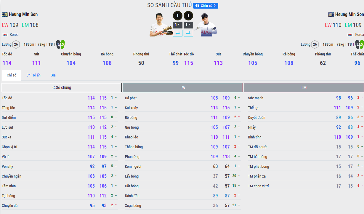 Tốc độ của Son Heung Min 23TY có thể coi là không có cải thiện nào so với phiên bản cầm chiếc giầy vàng cả, dù về mặt chỉ số là cả tăng tốc và tốc độ đều cao hơn 1 đơn vị nhưng bản thân tiền đạo này chạy đã nhanh sẵn, nên có thể mắt thường rất khó phân biệt được.