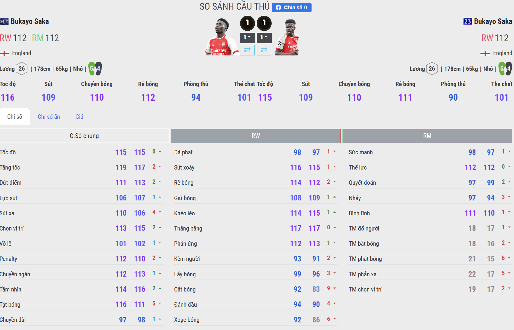 Cảm giác tốc độ của Saka không có nhiều sự khác biệt, tiền đạo Arsenal ở cả 2 phiên bản đều cho thấy khả năng đua tốc rất tốt, mặc dù vậy vẫn có 1 chút cảm giác về tốc độ tối đa của mùa 23UCL có phần yếu hơn so với 24TY.
