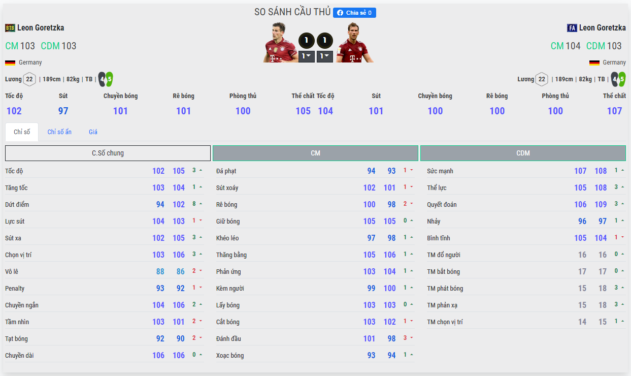Đây có lẽ là khác biệt rõ nhất mà bạn có thể cảm nhận được giữa hai mùa giải này là mùa FA dứt điểm tốt hơn, sút xa cũng tốt hơn. Hơn nữa có một điểm khá đắt giá là chỉ số ẩn sút xa của Goretzka FA sẽ hữu dụng hơn trong GLXH. Trong khi đó BTB lại bị mất đi tới 2 chỉ số ẩn.