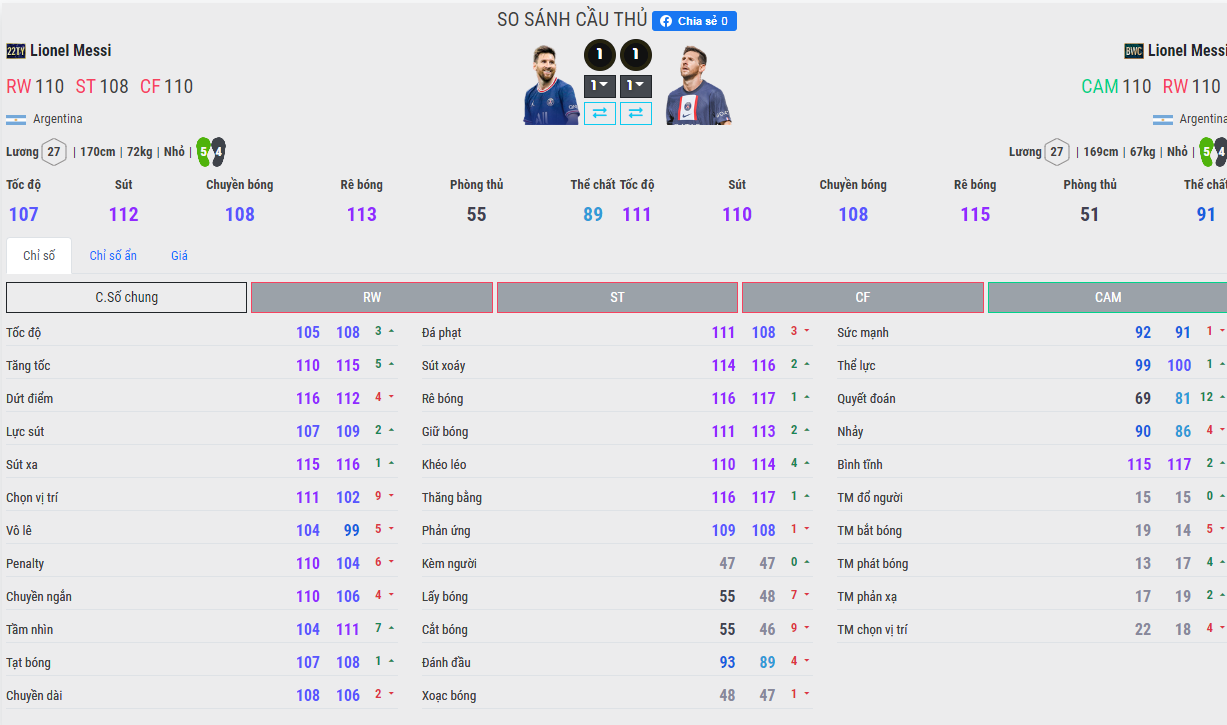 Nếu bạn để ý một chút thì sẽ thấy chiều cao và cân nặng của Messi BWC thấp hơn 22TY. Có thể nói vui là thời điểm 2014 thì Messi chưa béo lên, tuy nhiên điều này lại có ảnh hưởng kha khá đến trong game. Trọng tâm của Messi thấp hơn một chút và tương đối khó ngã trong các tình huống bị đè, tất nhiên nếu chơi lao vào người vào thì lại khác.