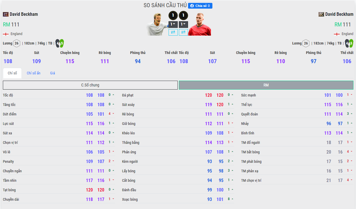 Có một chút khác biệt ở đây, nếu bạn để ý thì sẽ thấy là mùa DC có thêm chỉ số ẩn sút xa, tất nhiên người cho rằng nó chỉ có tác dụng trong GLXH nhưng thực tế khi thi đấu bạn sẽ thấy là DC sút tốt hơn mùa CC khá nhiều, điều này cho phép bạn hoàn toàn có thể kéo Beckham vào đá CAM hoặc hơi lệch một chút về cánh. Ở meta hiện tại việc có thể dứt điểm từ xa rõ ràng là lợi thế hơn nhiều.