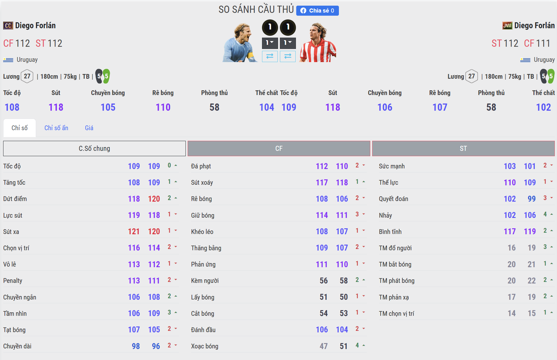 Về mặt tốc độ, có thể thấy rõ 2 phiên bản kể trên có nhiều nét tương đồng về khả năng di chuyển và bứt tốc trong FC Online. Cả 2 phiên bản đều cho thấy sự nhanh nhẹn và hiệu quả trong các tình huống di chuyển. Nếu để Forlan bứt tốc trước sẽ rất khó để đuổi kịp bởi gia tốc ingame cho cảm giác còn nhanh hơn so với chỉ số.