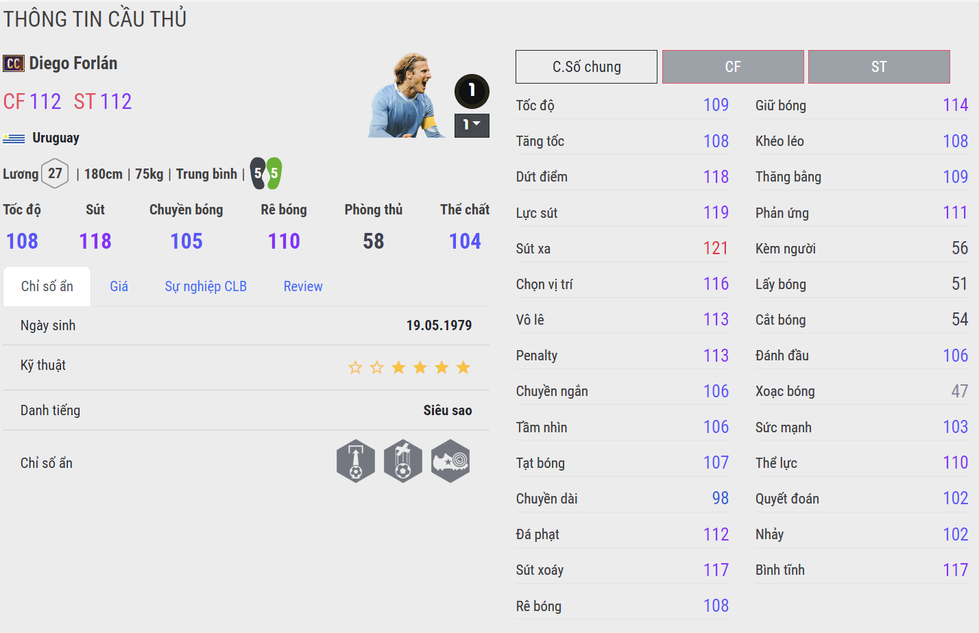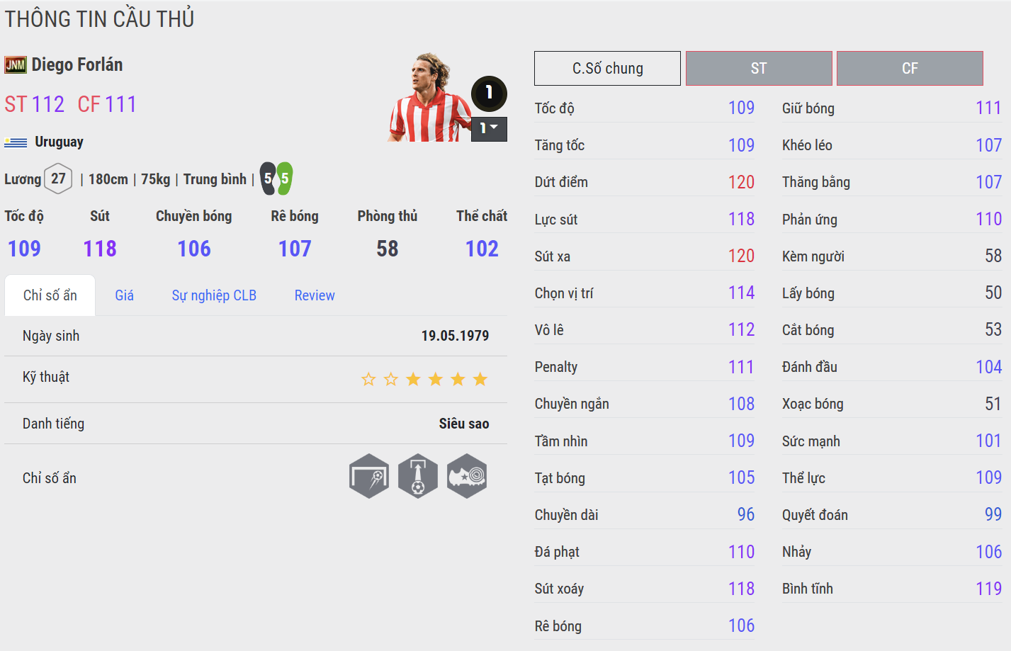 Diego Forlan được xem là một trong những tiền đạo hộ công quốc dân của FC Online hiện tại. Quả bóng vàng World Cup 2010 thể hiện phong độ nổi bật và khả năng thi đấu toàn diện ở mặt trận tấn công khi vừa có thể đá tốt tiền đạo cắm lại vừa có thể thi đấu tốt ở vai trò hộ công.