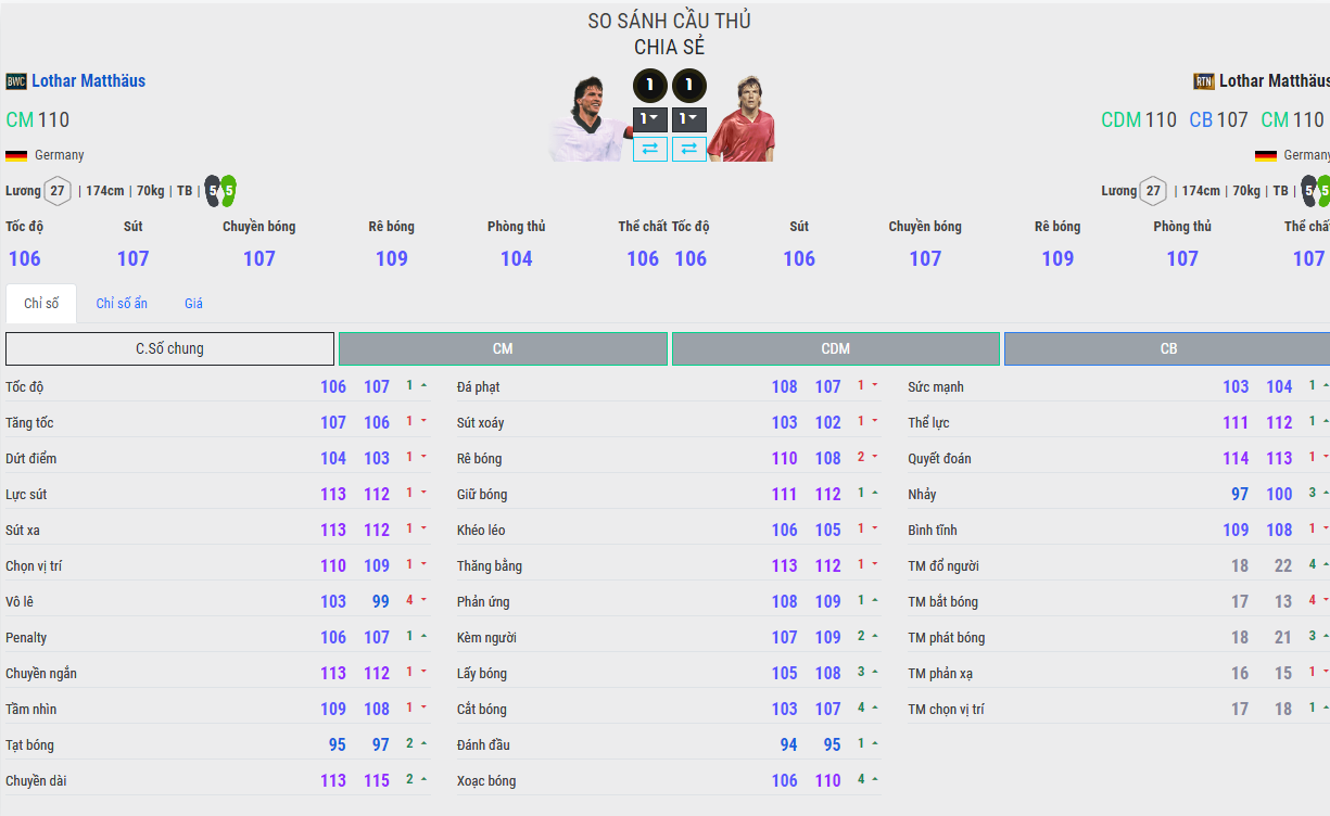 Mặc dù thẻ BWC không đề xuất vị trí CDM nhưng có lẽ đa phần người chơi Matthaus đều ưa thích xếp ông ở vị trí này, bởi lối chơi thông minh và vào bóng rất rát của ông. Xét về khía cạnh cắt bóng thì BWC vẫn nhỉnh hơn so với RTN cho dù chỉ số mùa RTN cao hơn. Điều này có lẽ sẽ ảnh hưởng rất nhiều đến cách chọn lựa của các bạn bởi các tiêu chí khác gần như...copy hoàn toàn.