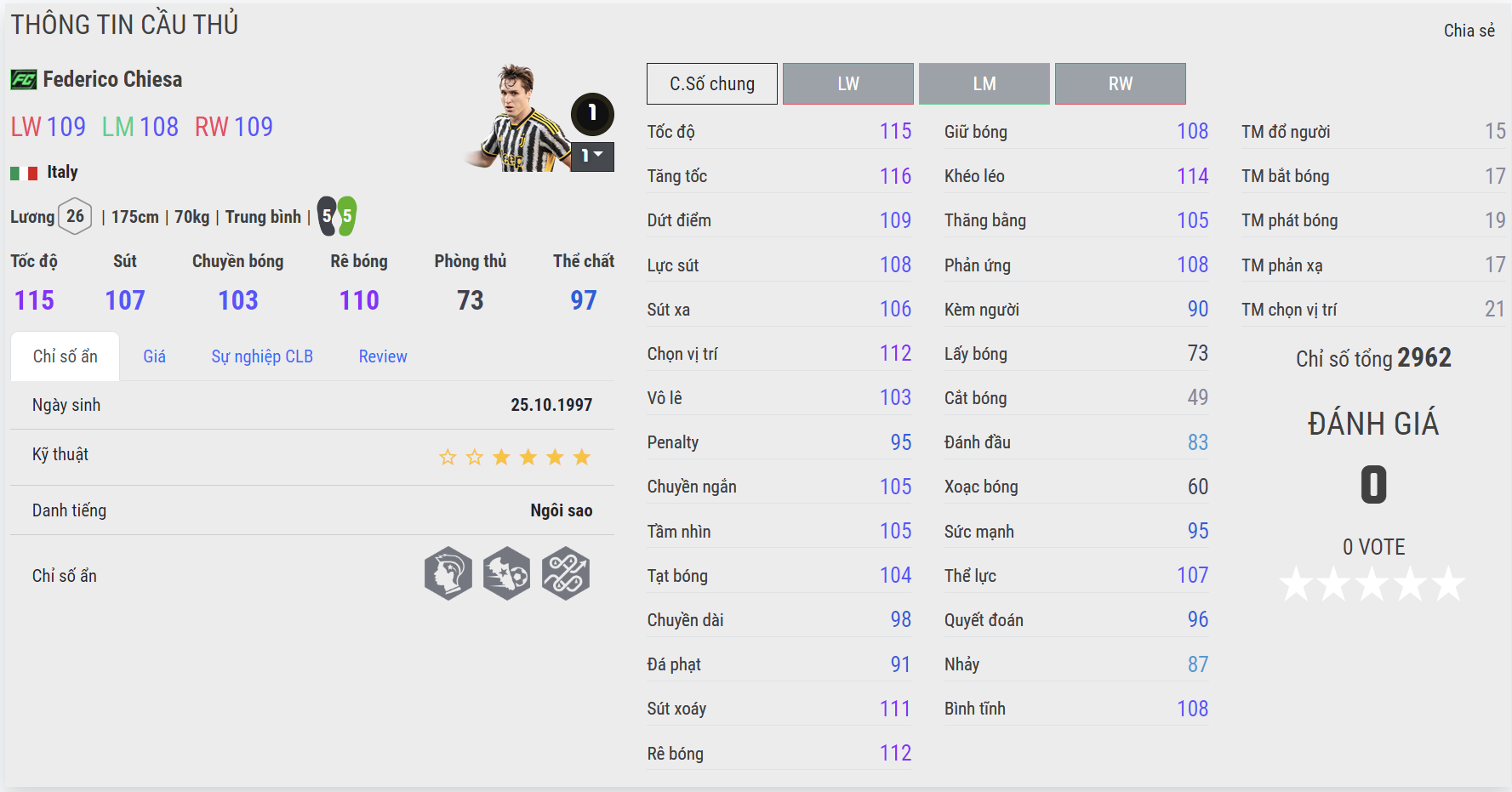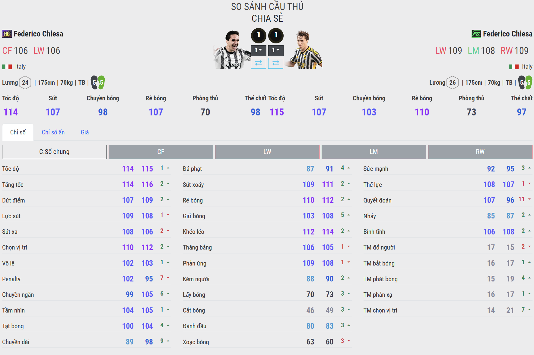 Trong game, Chiesa phiên bản HG giữ vững phong độ ổn định là một trong những tiền vệ cánh được xử dụng nhiều nhất rank Hàn ở cả 2 vị trí nơi hành lang cánh về độ toàn diện. Tuy nhiên, sự xuất hiện của mùa giải mới khiến nhiều người chơi muốn trải nghiệm cũng như nâng cấp mùa giải cũng như nâng lương cho Chiesa. Vậy giá trị sử dụng ở 2 mùa giải này ra sao? Hãy cùng xem bài viết dưới đây.