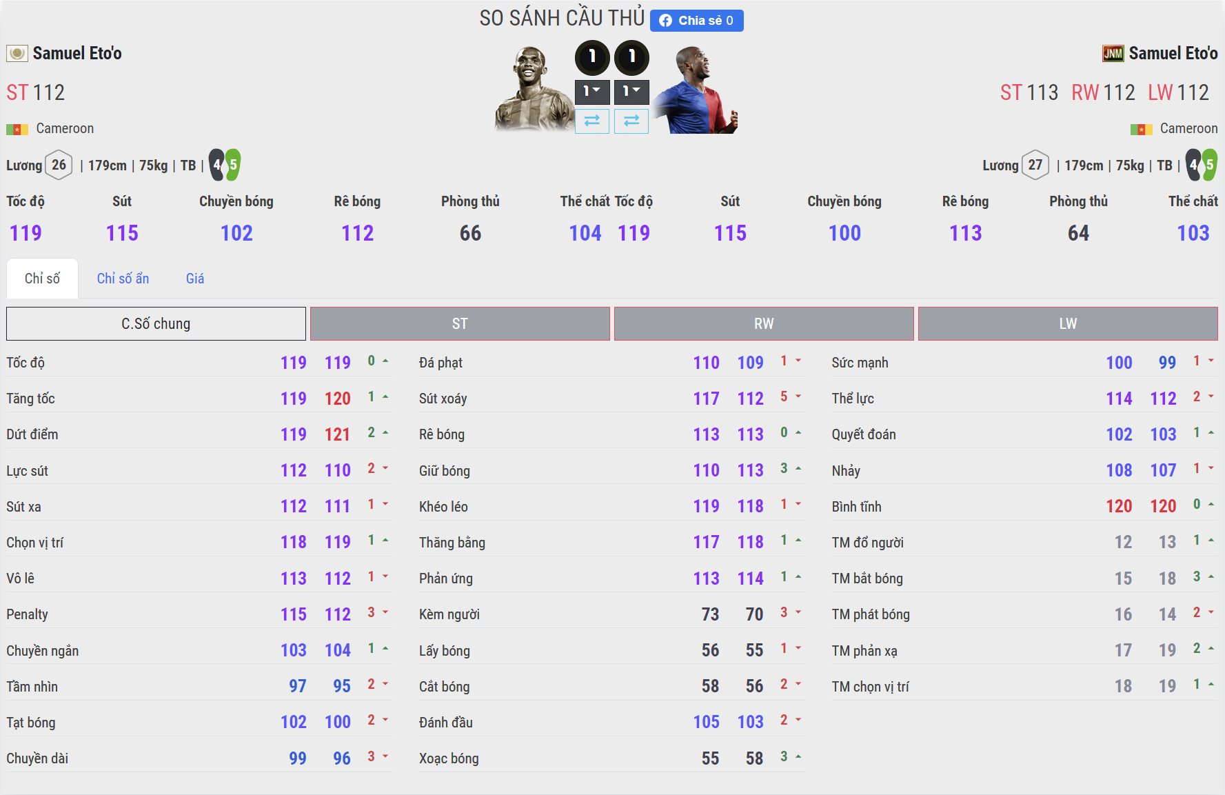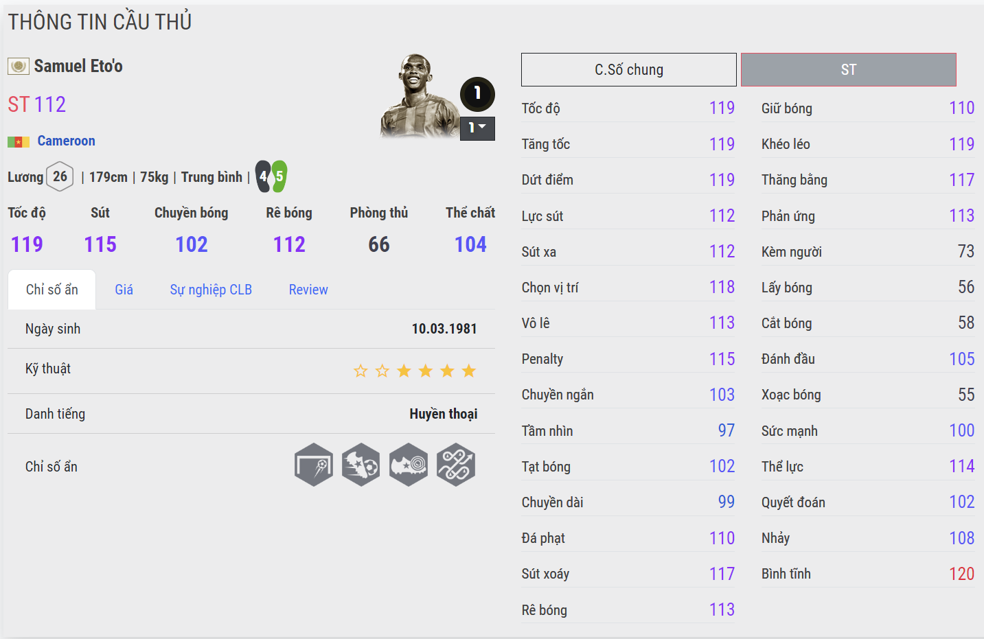 Samuel Eto'o được đánh giá là một trong những tiền đạo cực kì hay ở FC Online thời điểm hiện tại. Báo đen của Châu Phi đang cho thấy sự hiệu quả và hợp meta đến bất ngờ. Điều này khiến cho nhiều HLV giành sự quan tâm lớn khi Eto'o có cho mình nhiều team color chất lượng như Real, Barca, Chelsea, Inter Milan...