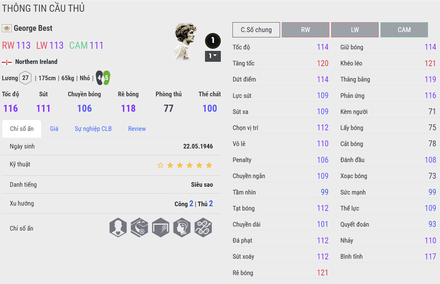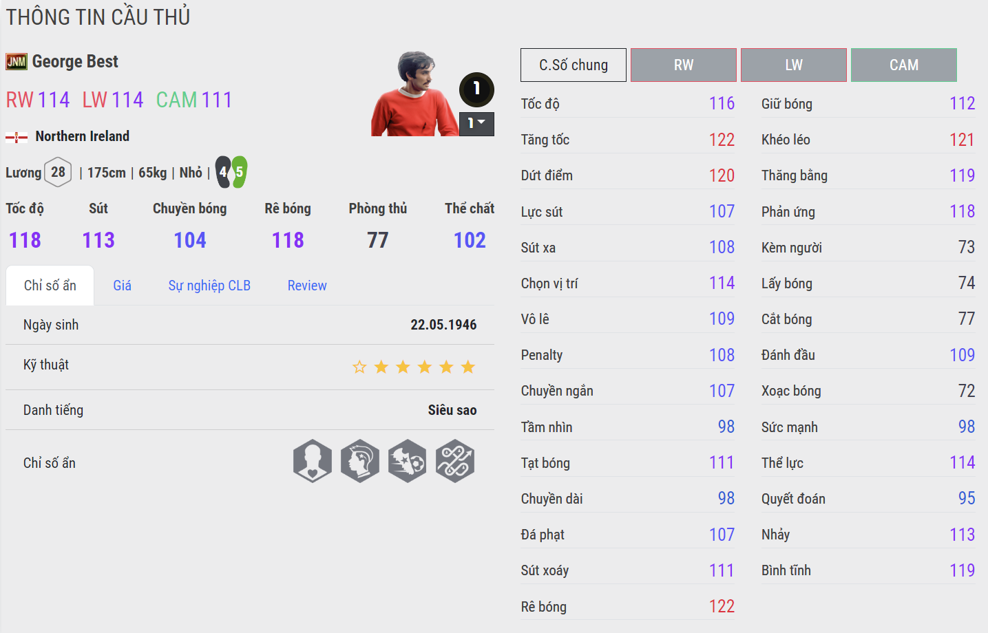 George Best được đánh giá là một trong những cầu thủ chạy cánh huyền thoại của Man Utd một thời. Ông vẫn được đánh giá là một trong những cầu thủ chạy cánh kỹ thuật và đáng được quan tâm trong FC Online.