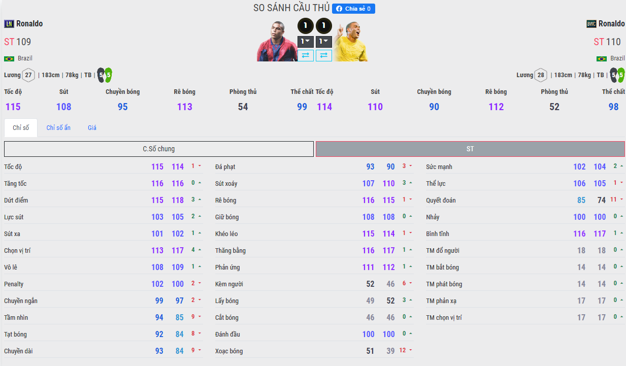 Với những cầu thủ có tốc độ cao như Ronaldo thì việc tỳ đè không còn quá quan trọng, bởi rất ít khi bạn phải thực hiện các động tác tranh bóng từ phía đối phương. Đa phần tốc độ sẽ giúp bạn vượt qua nhanh và dễ dàng hơn. Vì vậy các yếu tố về khả năng dứt điểm, chạy chỗ sẽ là ưu tiền hàng đầu để sử dụng. Các sự thua thiệt của mùa giải BWC so với LN là gần như không đáng kể, tuy nhiên ở chiều ngược lại thì có thể nói rằng BWC cũng không quá vượt trội so với LN. Nếu dư rả tài chính bạn có thể chọn BWC nhưng ở thời điểm hiện tại thì mức giá vẫn hơi cao.