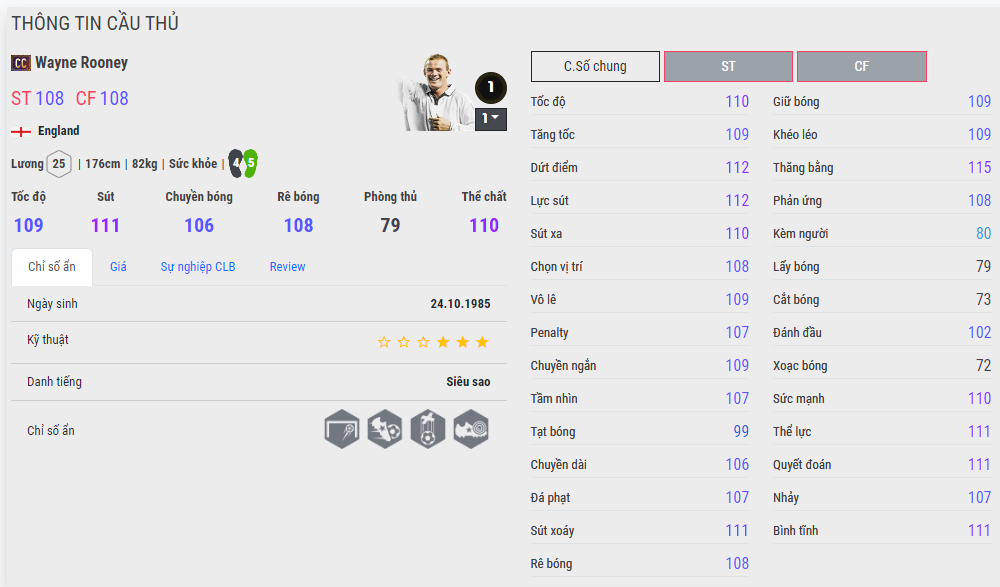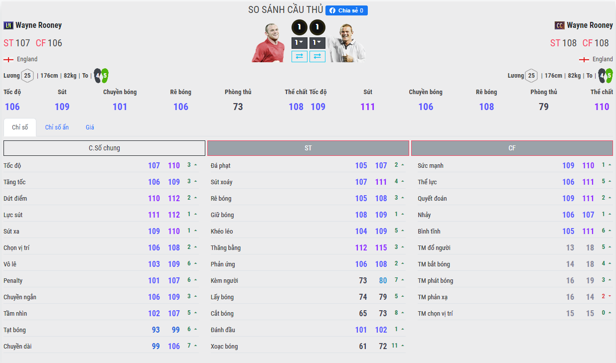 Mặc dù chỉnh chênh nhau 1 chỉ số Ovr nhưng điểm tốc độ của Rooney CC là nhỉnh hơn, và vấn đề nằm ở chỗ mùa giải CC có cho mình skill ma tốc độ. Nó giúp cho những cú đẩy bóng dài và tăng tốc của Rooney tỏ ra hiệu quả hơn hẳn. Nên có thể nói rầng phiên bản Century Club của Rooney là tốt hơn LN.