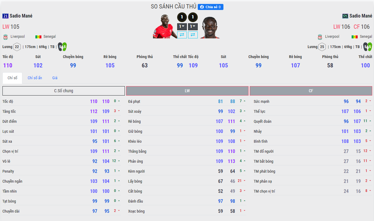 1. Tốc độ : Mane 21UCL tỏ ra nhanh hơn, sức rướn cũng tốt hơn rất nhiều. Điều này giải thích tại sao nhiều người đặt Mane 21UCL ở vị trí ST hoặc CF. Tuy nhiên khi sang đến mùa SPL thì ưu thế về mặt tốc độ đã giảm đi đôi chút nên việc đặt Mane ở vị trí ST sẽ không còn được như 21UCL nữa. Nhưng nếu đặt ở CF hay LW thì vẫn rất tốt.