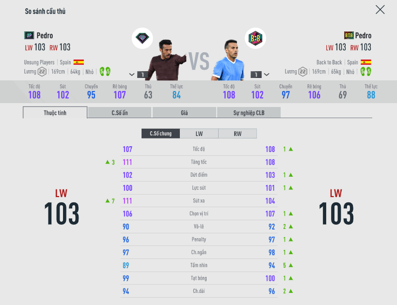 Cả hai mùa đều có bộ kỹ năng gần như tương đương, tuy nhiên nhờ trụ tốt hơn nên Pedro BTB có những pha đột phá ảo diệu hơn so với UP, tỷ lệ tung ra các đường chuyền dọn cỗ cũng nhiều hơn.