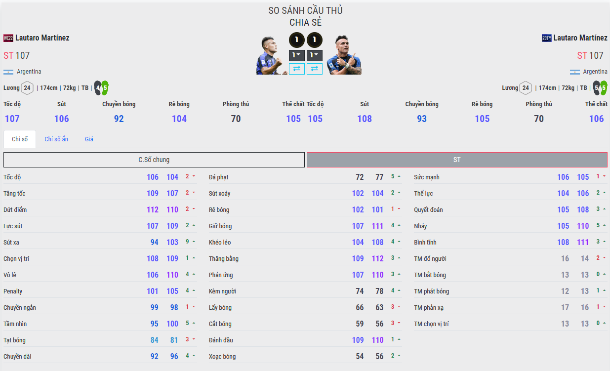 Mặc dù chỉ số dứt điểm của 23TY thấp hơn, nhưng bù lại chân trái đã được nâng cấp lên 5 sao, giúp cho bây giờ Lautaro có thể thoải mái hơn trong việc tung cú sút mà không cần đắn đo xem có đúng chân thuận hay không. Khả năng dứt điểm từ xa cung được nâng cấp cho phù hợp với meta hơn. Ít nhất ở tầm 16m50 bạn cũng đã có thể nghĩ đến sút bóng được rồi, trong khi WC22 thì thường phải vào tầm 11m