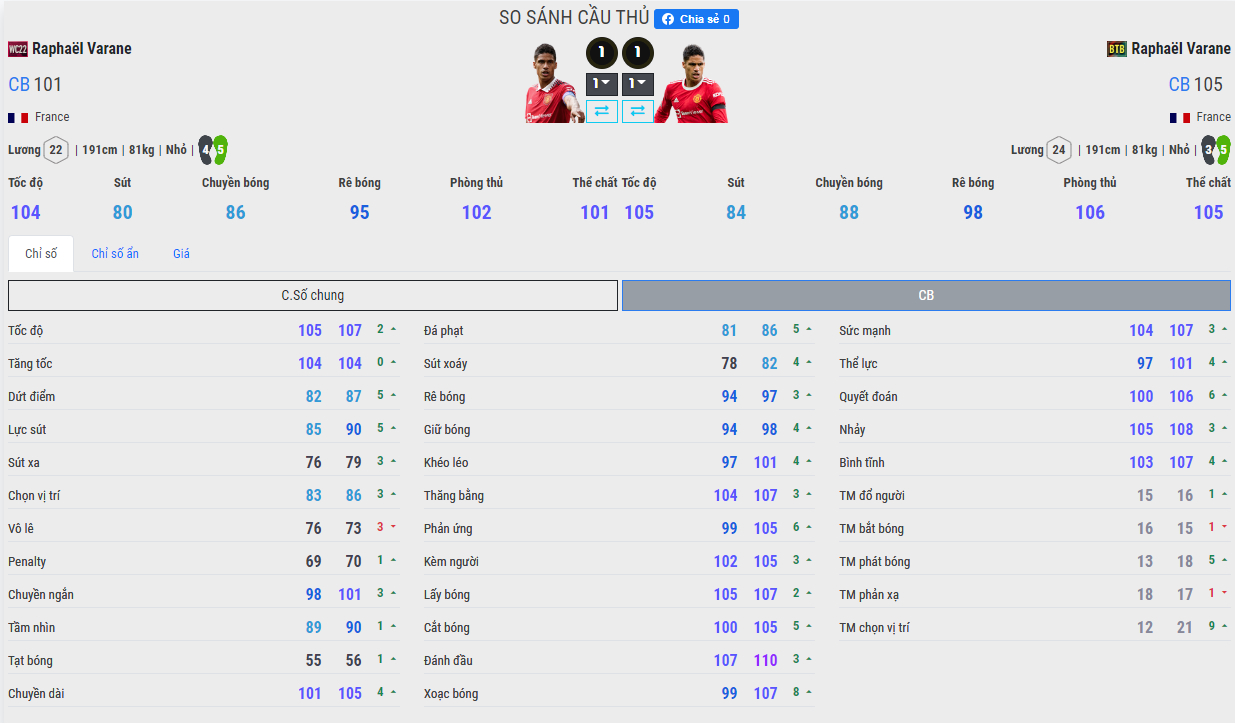 Như vậy các bạn có thể thấy, mùa giải WC22 rõ ràng có nhiều lợi thế hơn so với mùa BTB, trong khi đó mức lương lại ít hơn, khả năng đánh chặn cũng tốt hơn. Khi mà các trung vệ cũ đều bị nerf đi do thay đổi meta thì Varane WC22 là một sự thay thế khá phù hợp với mức lương chỉ có 22, ít hơn 2 đơn vị so với BTB