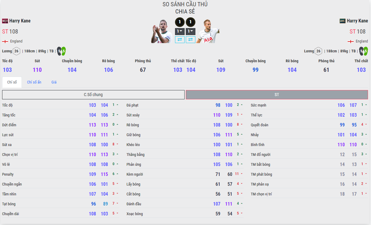 Điều mà bạn nhìn thấy khá rõ là chỉ số ẩn của Kane BWC gần như không có bất cứ chỉ số nào giúp ích cho việc dứt điểm của anh ấy cả, nhưng thực tế thì cả hai mùa đều bèn như nhau. Có điều cách dùng của mùa BWC sẽ khác đi đôi chút với mùa WC22, BWC cần chơi theo kiểu tiền đạo mục tiêu là đích đến cuối cùng của mọi đường chuyền còn WC22 có thể đa dạng lối chơi hơn.