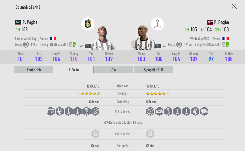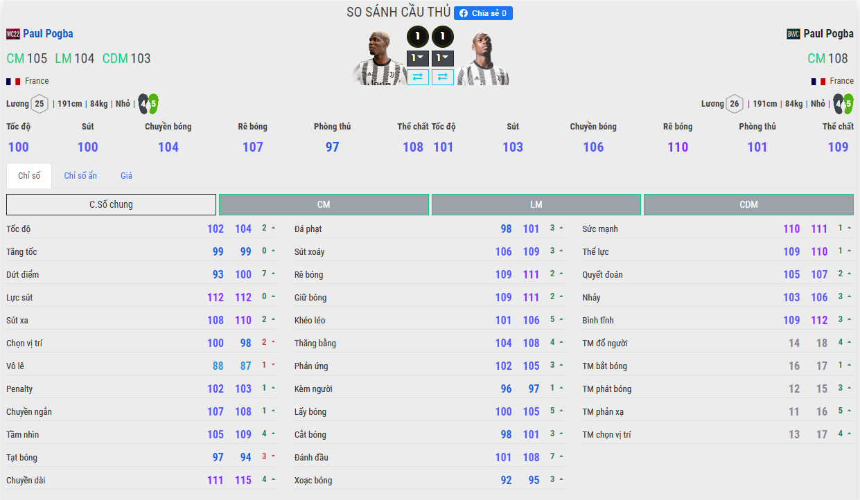 Pogba có thể chơi tốt ở cả CM lẫn CDM, nếu để chọn CDM thì có lẽ mùa WC22 sẽ làm bạn hài lòng hơn đấy, cho dù chỉ số thành phần có sự thua thiệt hơn. Nhưng những khoản cắt bóng, lấy bóng hay thậm chí là không chiến đều hơn so với BWC.