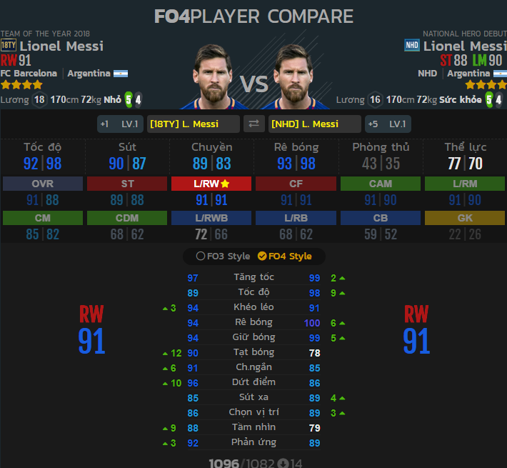 Messi TOTY và Messi NHD, TOTY liệu có hay hơn hoàn toàn? Với mức giá 1tr7 bp ở thẻ +1 và 38tr bp ở thẻ +5 của Messi NHD so với mức giá lên tới 40tr bp thì có lẽ chúng ta có thể cân nhắc lựa chọn Messi NHD +5 để so kè cùng Messi TOTY Trước tiên, nếu bạn nhìn vào vóc dáng của cả 2 với chiều cao 1m70 và 72kg, nhưng vóc dáng của cả 2 lại khác nhau khi Messi TOTY có thể hình nhỏ còn Messi NHD lại có thể hình sức mạnh. Vị trí của Messi TOTY +1 là RW và OVR 91 ở cả RW,CF,CAM,RM và mức chỉ số 89 ở vị trí ST. Còn Messi NHD +5 có OVR 88 tuy nhiên ở vị trí RW,CF chỉ số lên mức 91 với sự vượt trội về chỉ số tốc độ, thăng bằng cũng như giữ bóng và rê bóng. Có thể thấy được Messi NHD có bộ chỉ số tốt cho việc hoạt động bên hành lang cánh hơn còn Messi TOTY thì lại có bộ chỉ số phù hợp với vi trí CF hơn. Bộ chỉ số ẩn của Messi TOTY cũng có một chút nhỉnh hơn so với Messi NHD khi ngoài những chỉ số ẩn Sút xoáy, Ma tốc độ, Bấm bóng(AI) ra thì còn có thêm chỉ số ẩn Sút xa(AI) và Kiến tạo (AI). Với viêc nên sắp xếp Messi TOTY ở vị trí CF và có thêm chỉ số ẩn kiến tạo và sút xa sẽ tối đa hoá công dụng hộ công của anh ta.