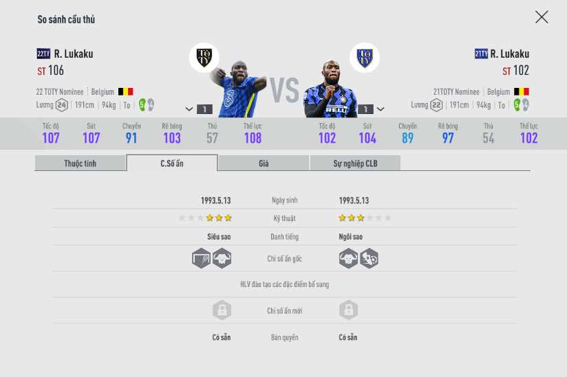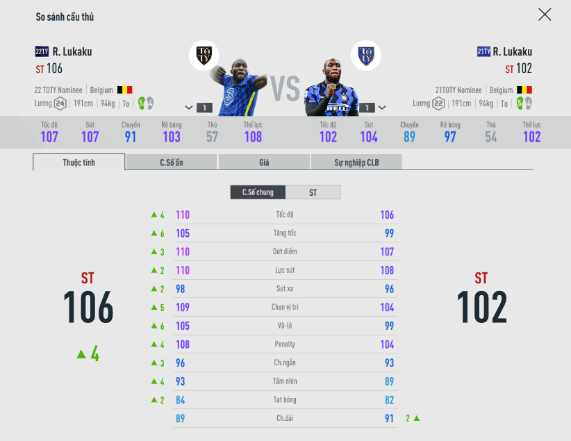 22TY chắc chắn là mùa mới ra và có sự tăng tốc vượt trội hơn hẳn so với 21TY. Tuy nhiên như rất nhiều cầu thủ khác trong game này, con số đôi khi chỉ là ảo, Lukaku có thể hình quá to và sức ỳ tạo ra cũng là rất lớn, khi mà Ovr cao kéo các chỉ số khác theo, còn thực chiến nhìn Lukaku tăng tốc cảm giác anh phải lấy đà khá là xa.