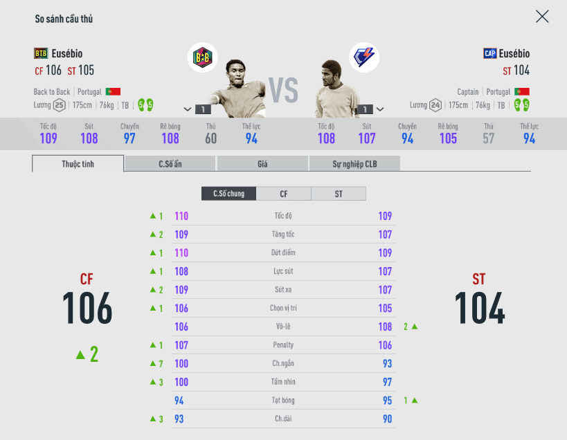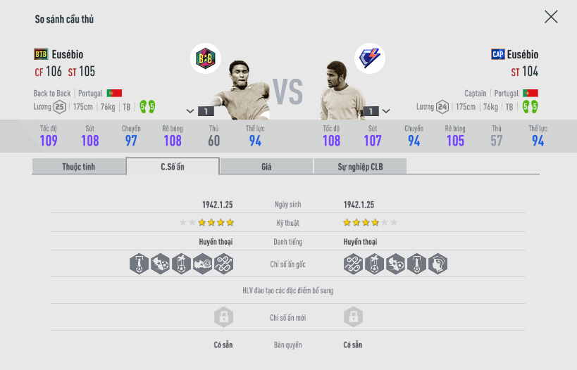 Nếu để ý bạn sẽ thấy mùa BTB có thêm vị trí CF, không phải tự dưng mà Eusebio BTB lại có thêm chỉ số này. Bởi xét theo góc độ chuyền bóng và kiến tạo cho đồng đội thì mùa BTB sáng hơn, trong khi mùa CAP thiên về một tay săn bàn hơn. Bạn có thể coi BTB như một bản nâng cấp của mùa LH
