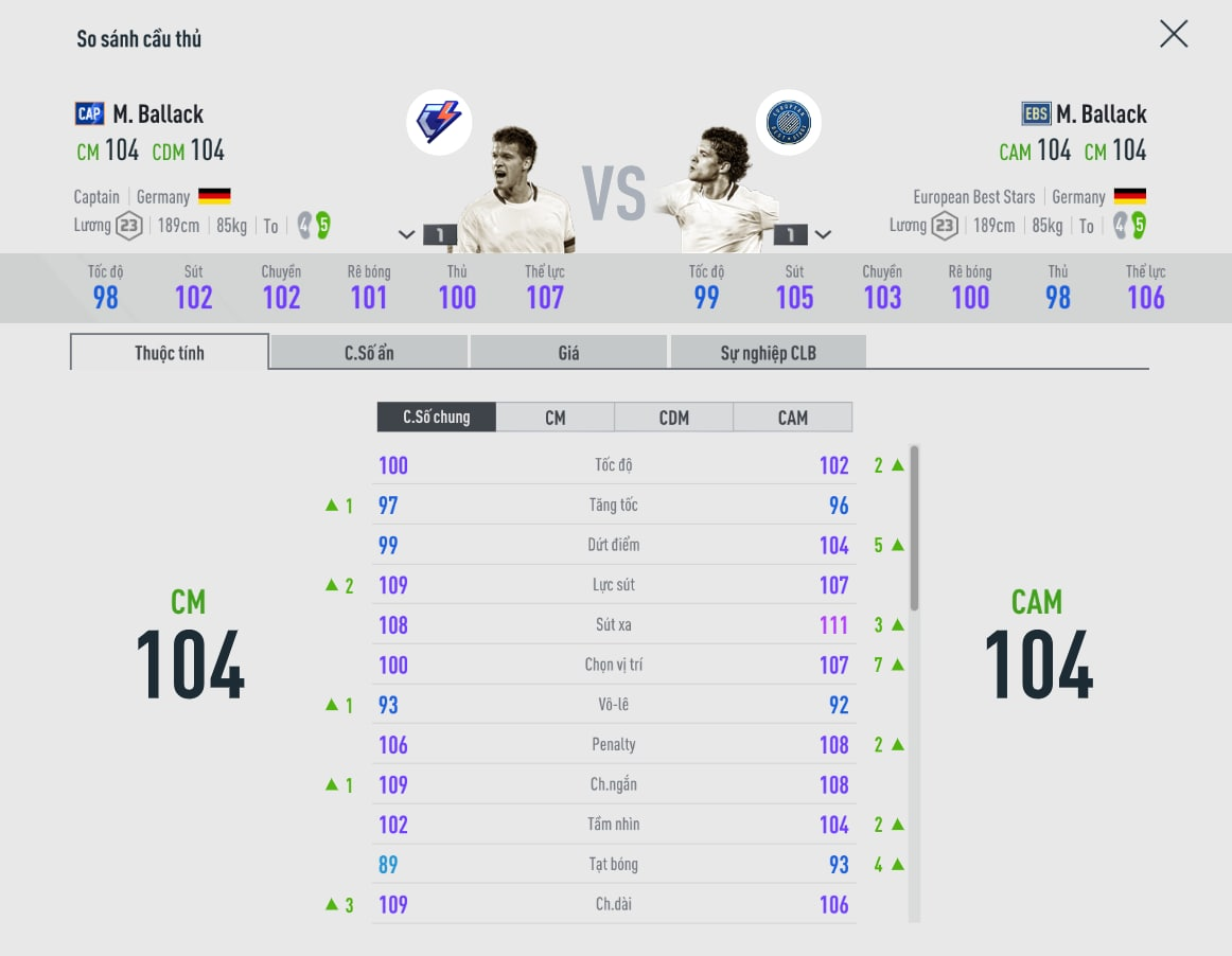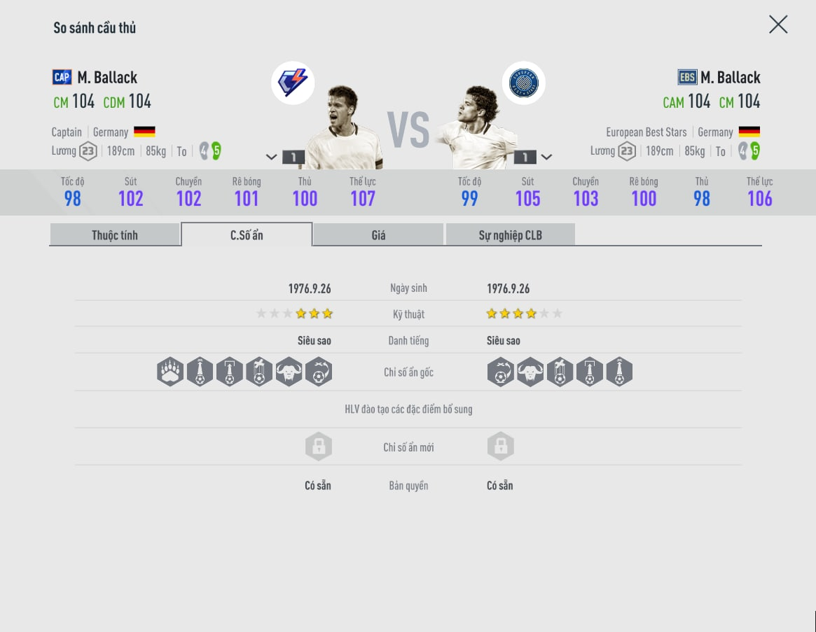 Tiền vệ quốc dân trong game đã có mùa giải ICON trong game tại máy chủ Hàn Quốc. Tuy nhiên ở sever Garena thì chúng ta trong lúc chờ đợi sự có mặt của siêu tiền vệ quốc dân này thì các bạn có thể sử dụng các phiên bản lỗi của Ballack như EBS hay CAP. Vậy sau khi ra mắt BTB và CAP thì EBS liệu có còn "ngon" nữa không ? mời các bạn đi vào phần so sánh của chúng tôi