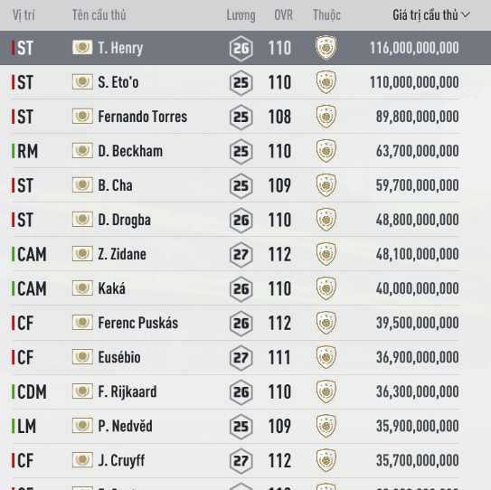 Có thể thấy tại sever chúng ta thì Henry, Eto ( mới ra ), Torres, Beckham là nhưng ICON có mức giá cao nhất. Bỏ qua những vấn đề về số lượng fan thì có lẽ cái tên Henry là mẫu số chung giữa cả hai sever khi đều là ICON đứng top. Tuy nhiên điểm khác biệt lớn nhất lại nằm ở vị trí của Kaka. Khi giá của sever chúng ta chỉ là con số 44B BP ít hơn rất nhiều với con số 113B hiện tại của sever Hàn. Rất nhiều game thủ bên Hàn đã tỏ ra ngạc nhiên với mức giá rẻ như vậy của sever Việt.
