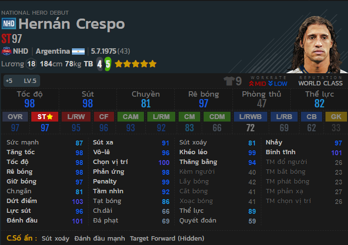 Crespo NHD là mẫu tiền đạo có hiệu suất ở mức trung bình. Với chỉ số ẩn sút xoáy và đánh đầu mạnh, đặc biệt là khả năng sút xoáy rất tốt. Khả năng sút của thẻ +5 là cực kì tốt đặc biệt là khả năng sút xoáy tầm trung.