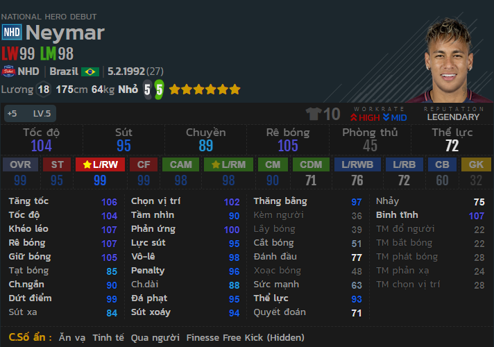 Neymar NHD +5 có một bộ chỉ số thống kê cực cao, một cảm giác rõ ràng của mọi người chơi sử dụng Neymar chính là ở sự mềm mại trong cách di chuyển của neymar. Được đánh giá ở khả năng rê bóng là rất dẻo, tốc độ cực cao, khả năng sút dụng tốt cả 2 chân và khả năng xử lý kỹ thuật vô cùng hiệu quả. Với mức thẻ +5, Neymar thực sự là quá nhanh quá nguy hiểm. Điểm yếu duy nhất của Neymar chính là khả năng tranh chấp kém do thể hình và sức mạnh không cao. Mặc dù vậy Neymar NHD +5 vẫn là một quân bài cực kì hiệu quả bên hành lang cánh thay vì những top cầu thủ mùa TT có mức giá tương đương.