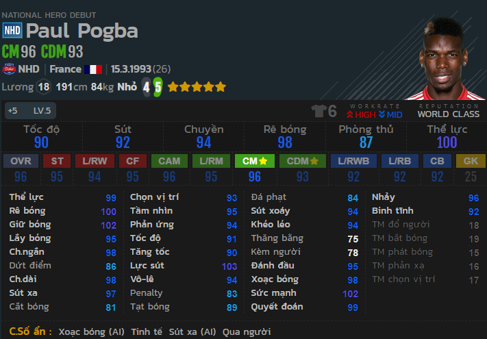 Pogba là một trong những mầu tiền vệ trung tâm toàn diện và hiệu quả với khả năng rê dắt, lừa bóng là rất tốt. Pogba có thể đá tốt cả 3 vị trí từ CAM,CM và CDM. Tuy nhiên sự hiệu quả nhất nằm ở vị trí CM hoặc CDM (tiền vệ trung tâm). Ngoài ra Pogba thực sự là một tiền vệ toàn diện bậc nhất game.