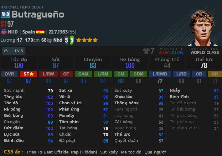 Butragueno có 3 chỉ số ẩn và nó đều thể hiện một cách cực kì rõ ràng trong game đó là khả năng Sút xoáy, Ma tốc độ và Qua người. Thực tế, với những ai đã từng trải nghiệm Butragueno trong game sẽ đều thấy giá trị rất lớn ở cả 3 chỉ số ẩn này khi nó được bộc lộ trong các trận đấu của Butragueno.