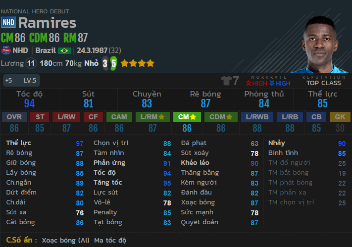 Ramires NHD +5 có tốc độ nhanh, tăng tốc tốt, khả năng rê dắt cũng như lừa bóng tốt. Là một trong những mẫu cầu thủ được người chơi Hàn Quốc vô cùng ưa chuộng.