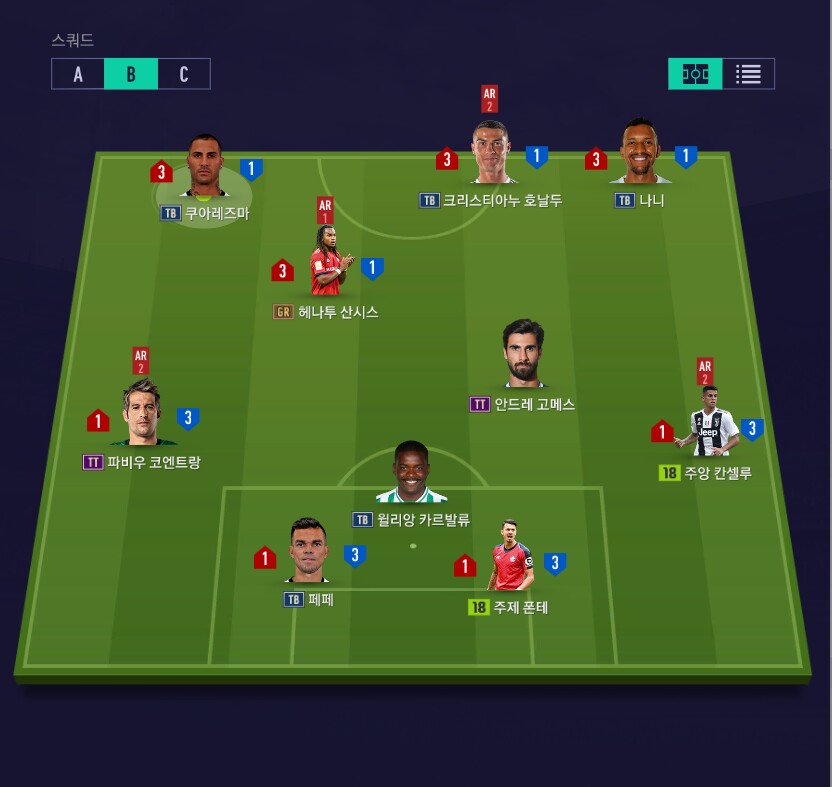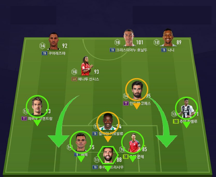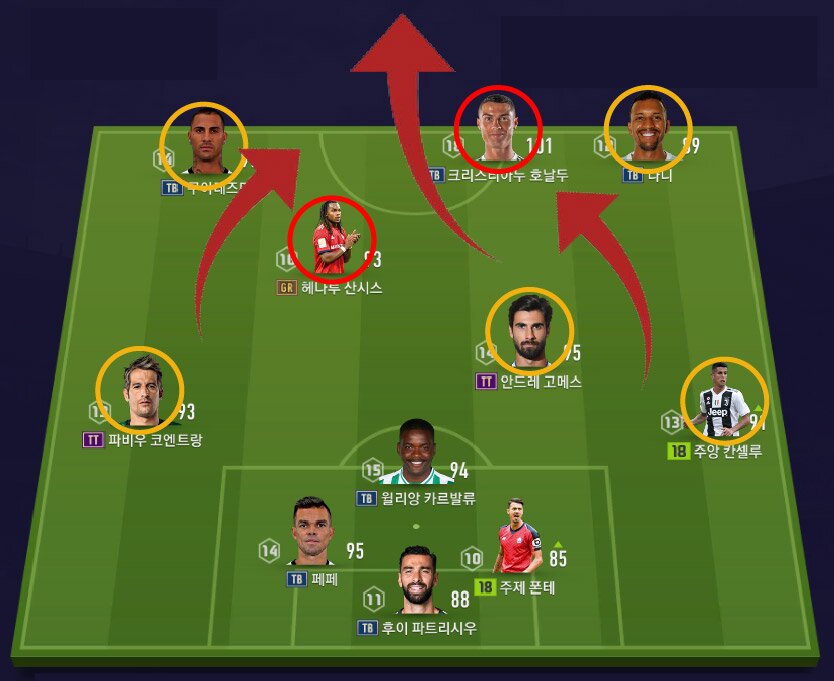 Trung tâm của các đợt tấn công không ai khác chính là CR7 với vị trí tiền đạo cắm trực diện và Renato Sanches với vị trí CF hộ công. 2 hành lang cánh là sự phục vụ của Quaresma và Nani.