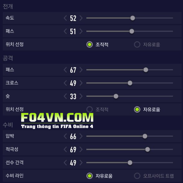 Sơ đồ chiến thuật tổng quát bạn có thể tham khảo khía dưới đây. Lối chơi nên thiết lập ở trạng thái cân bằng và tổ chức. Tấn công với tốc độ cao, di chuyển tự do nhằm linh hoạt cả 4 vị trí tấn công. Phòng ngự gây áp lực và quyết đoán cao, áp sát số đông khiến đối thủ mắc sai lầm.