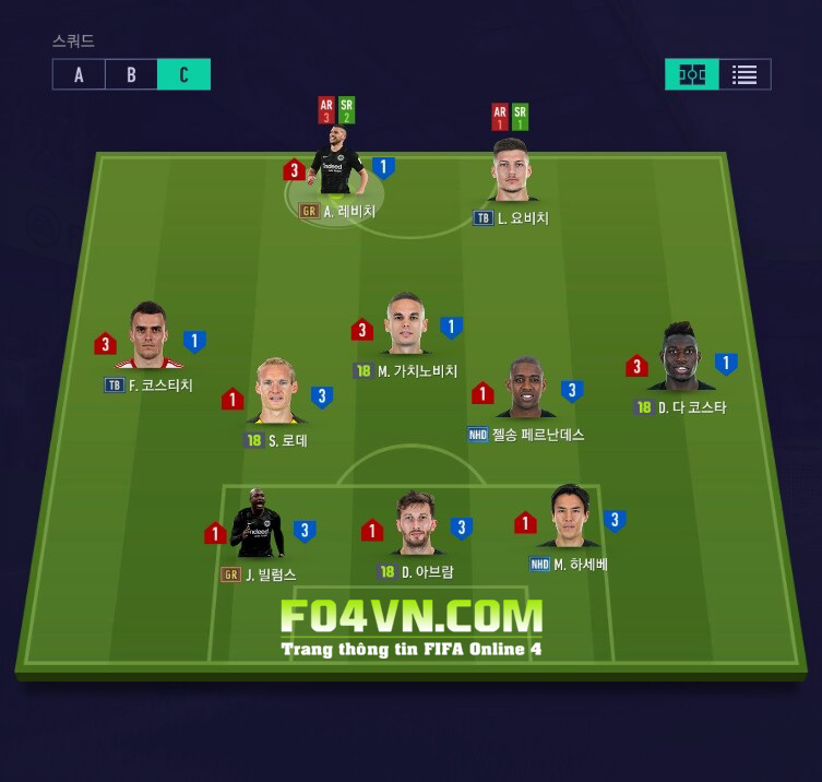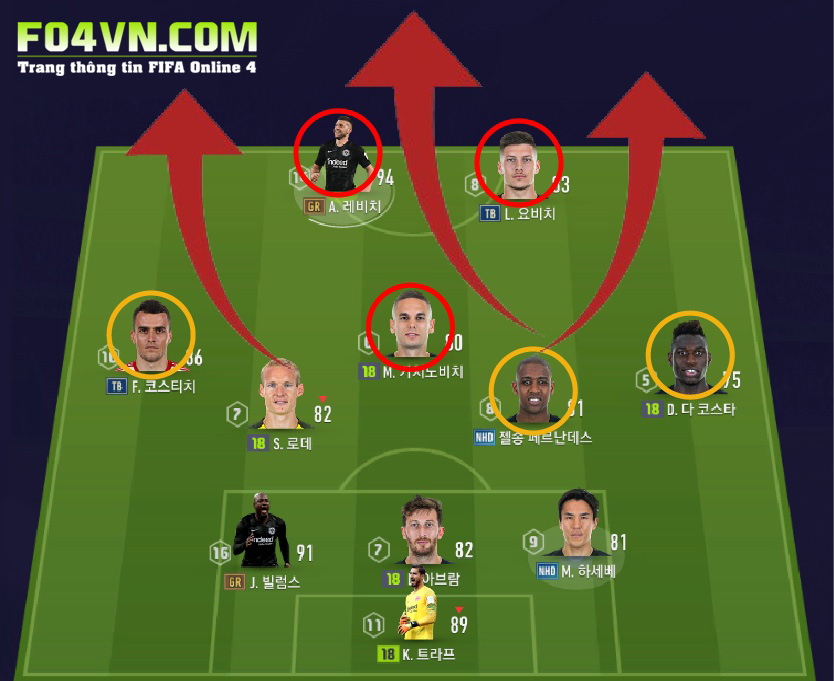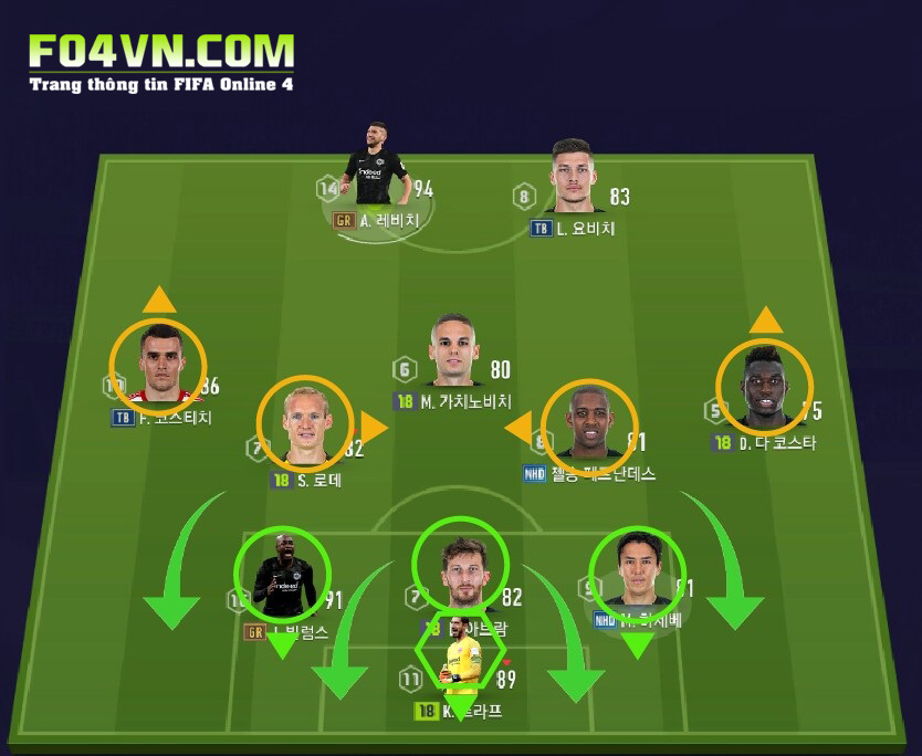 Sơ đồ chiến thuật của Frankfurt là sơ đồ 3-2-2-1-2 như hình bên dưới nhằm tối ưu hóa các vị trí trên sân cũng như lối chơi chung của toàn đội.