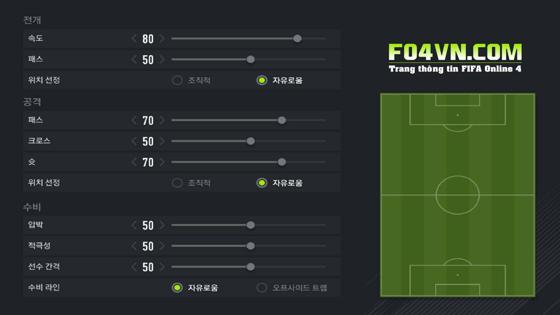 Tốc độ chơi nhanh với thiết lập cao. Chuyền bóng 50 kéo giãn đôi hình thi đấu ở mức trung bình. Tấn công tốc độ với mức chuyền 70. Đẩy mạnh các tình huống tạt bóng, sút xa từ ngoài vòng cấm.