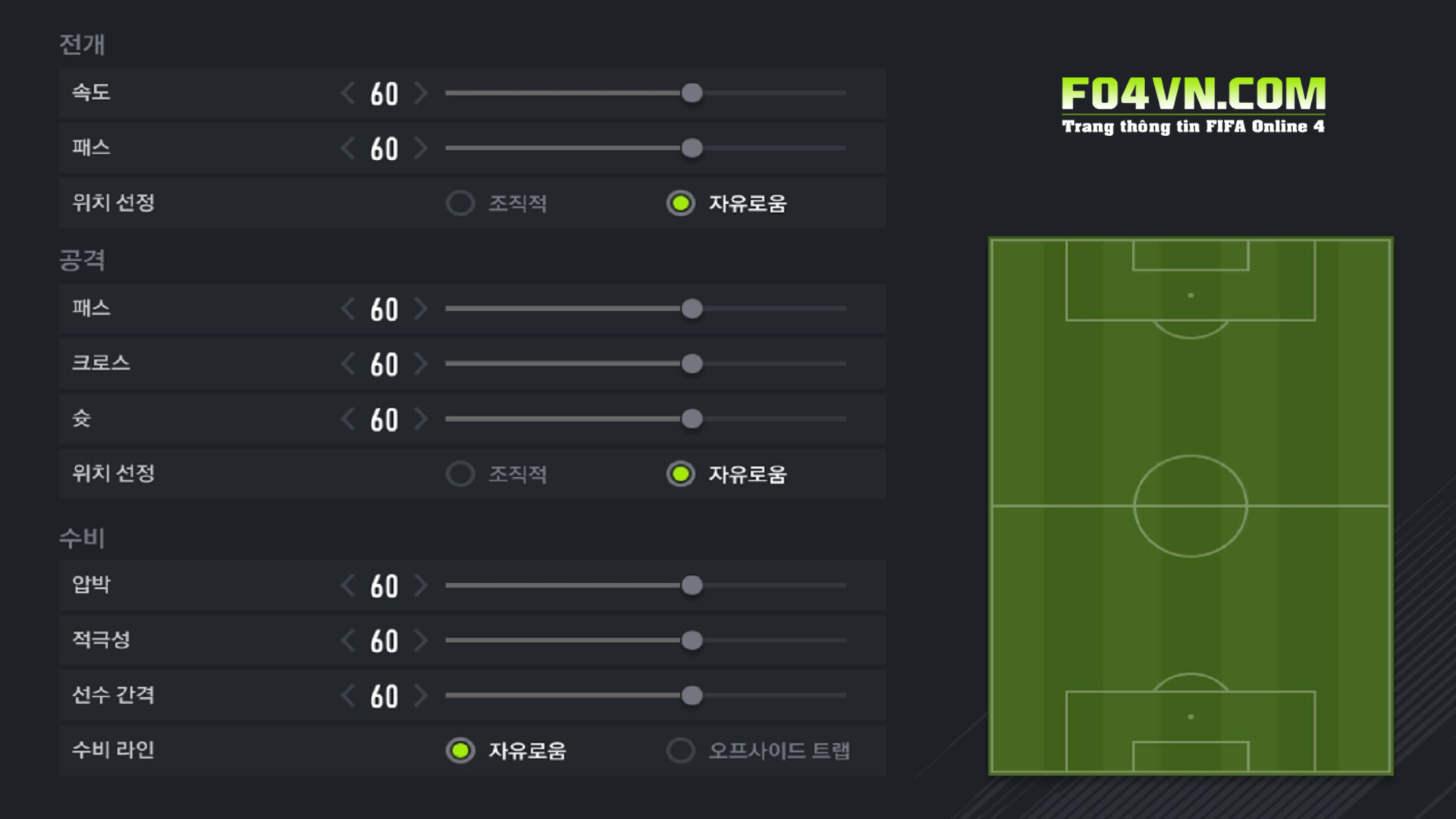 Tổng quát : Tốc độ chơi ở mức 60, mức trung bình cho các tình huống lên xuống. Chuyền 60 kéo giãn đội hình ở mức vừa phải, không quá giãn mà cũng không hẹp quá. Lối chơi chung tổ chức sẽ hạn chế việc các cầu thủ di chuyển lung tung sai vị trí.