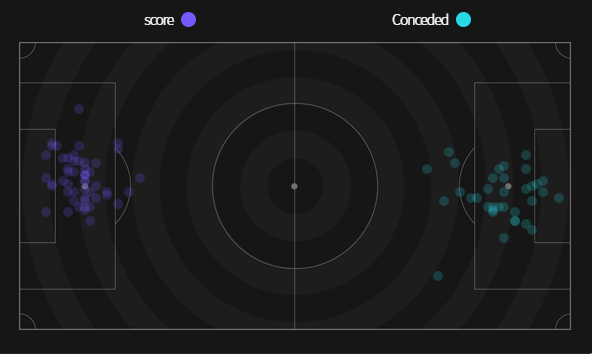 Bản đồ ghi các vị trí ghi bàn của HLV này trong 30 trận gần nhất
