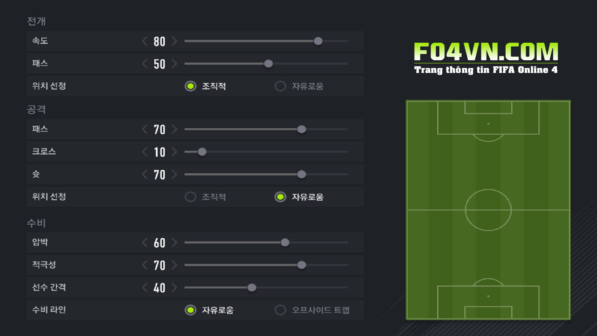 Tấn công với mức chuyền 70 tăng cường độ dâng lên nhận bóng tới từ các cầu thủ trên sân mỗi khi triển khai tấn công. Mức tạt thấp để kéo những đường tạt đến với cọc gần. Sút 70 nhằm thực hiện nhiều những tình huống dứt điểm từ xa hoặc tuyến hay nếu những vị trí tấn công chủ lực bị hậu vệ đối phương khóa. Lối chơi tấn công tự do linh hoạt