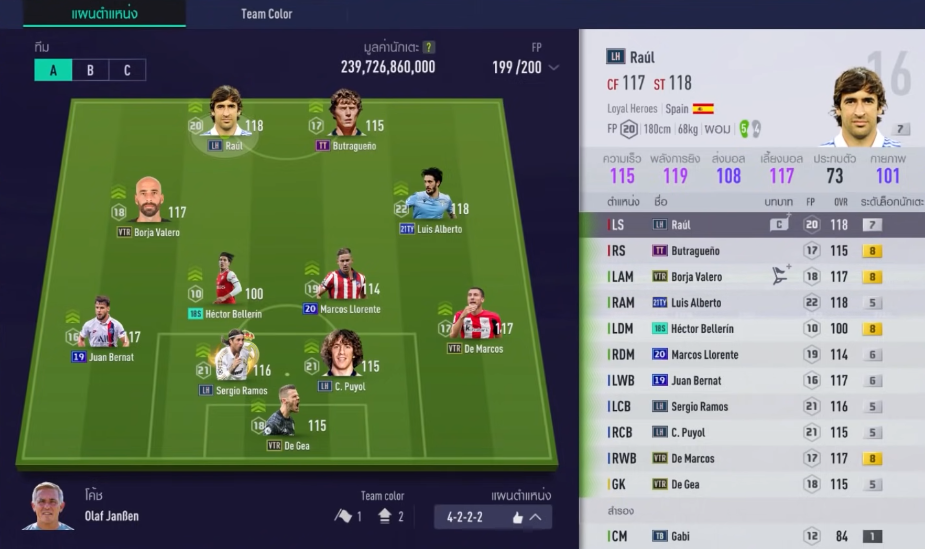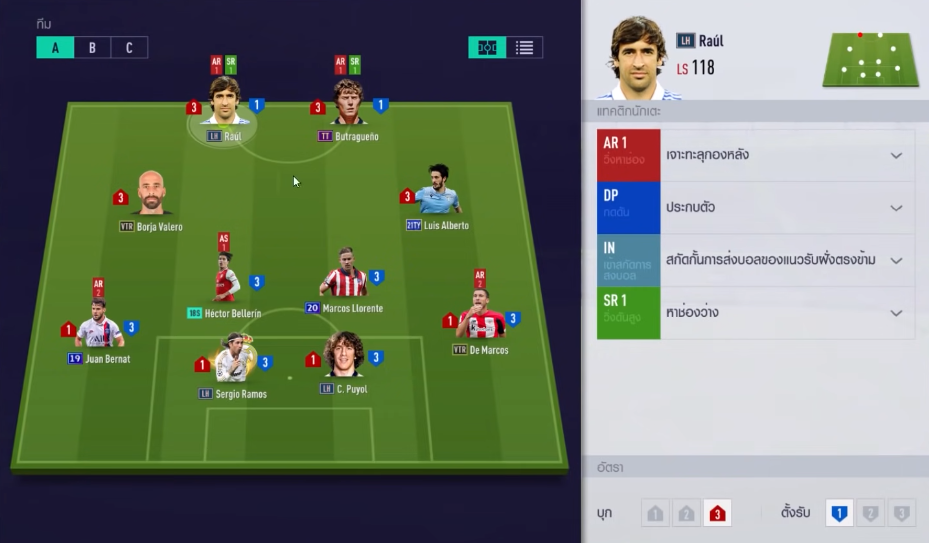 Có một chút đổi khác so với một Tây Ban Nha mà chúng ta biết, đó là lối chơi 4222 thiên về tấn công cánh và sử dụng tốc độ cũng như độ nhạy của cặp tiền đạo trứ danh Raul và Butragueno. Chính vì thế mà tốc độ của lối chơi được đẩy lên rất cao. Bạn hoàn toàn có thể áp dụng lối đá phản công nếu muốn. Tuy nhiên nhìn vào cách thiết lập thì những người Thái thích dồn ép đối thủ hơn, khi chọn pressing tương đối cao