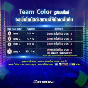 Ngày hôm qua 10/8/2019 Garena Thái Lan đã nhá hàng tính năng team color đang rất được mong chờ trong thời gian qua. Đây là chức năng buff team cực hay đến từ fifa online 3, nhưng sang Fo4, đã bị nexon lãng quên. Có lẽ nhận ra sự thiếu sót đó. Team Color đã được quay trở lại, hứa hẹn những cách build team độc lạ và sáng tạo hơn. Khi mà người chơi Fo4 đã quá nhàm chán với những Gullit, Vieira, Van Dijk...