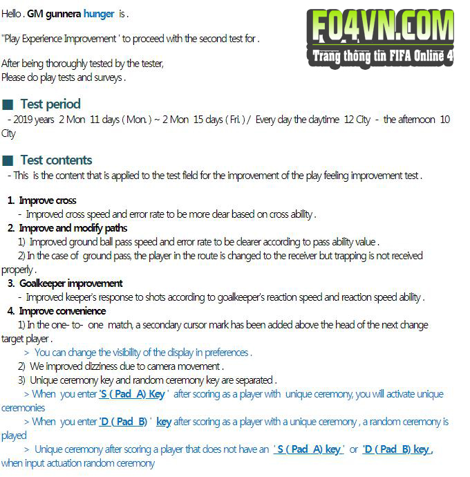Ngày hôm nay thì trên trang thông tin về fo4 của Hàn, một GM phụ trách đợt test thứ 2 đã tiết lộ những thông tin về đợt test 11/2/2019 - 15/2/2019