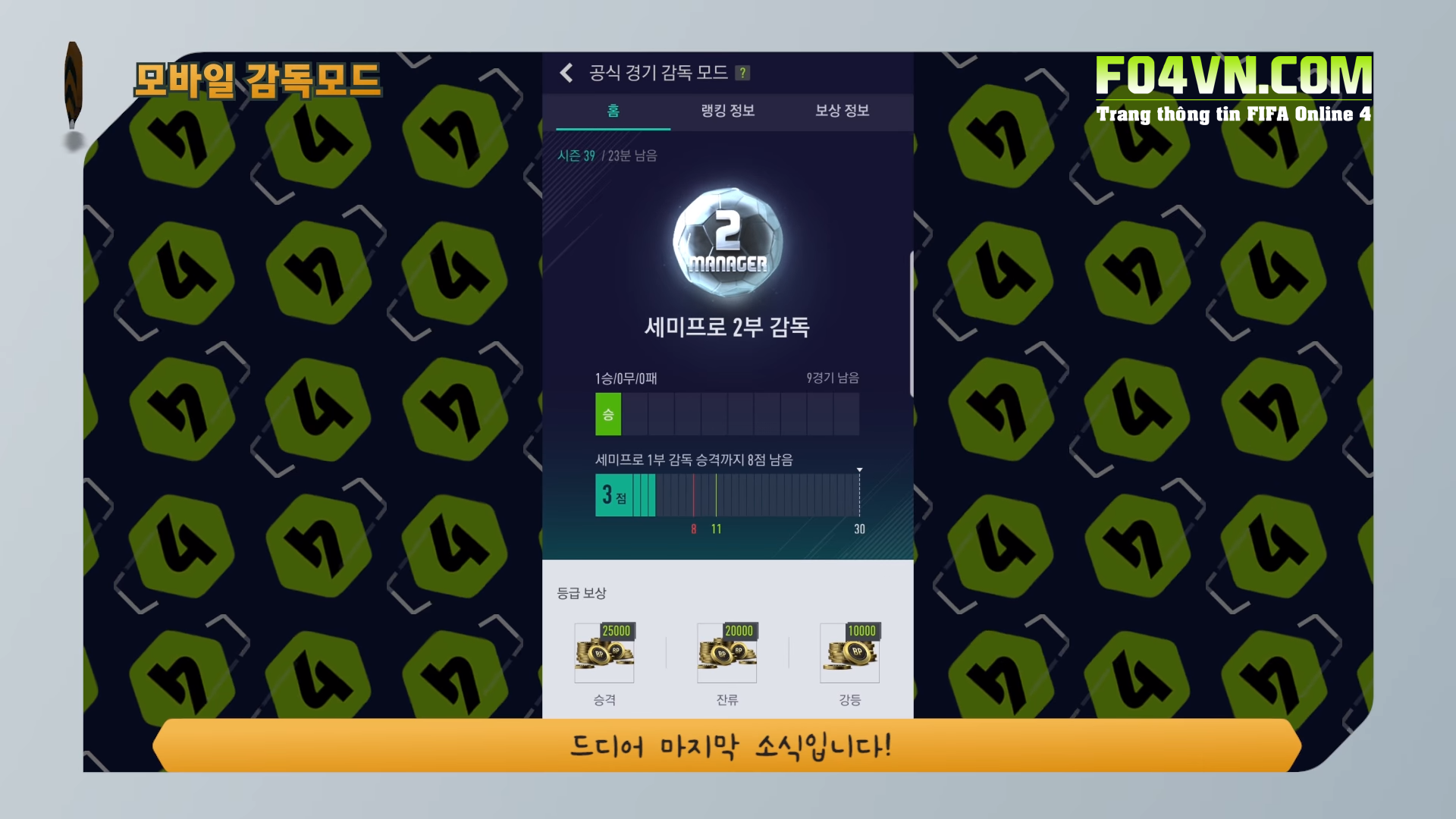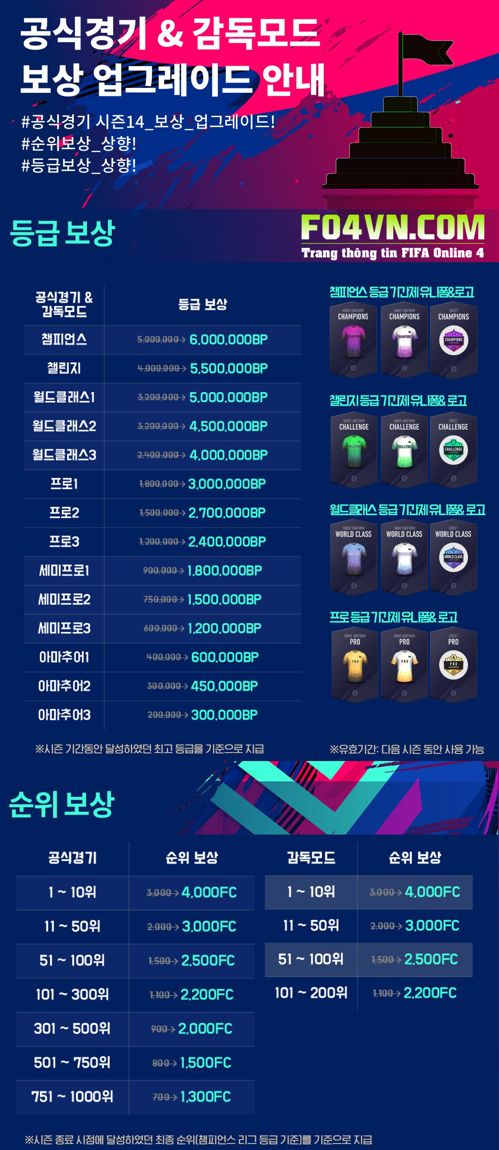 Ngày 25/7/2019, FIFA Online 4 Hàn Quốc bảo trì và cập nhật tính năng mới. Cùng với đó là thống kê rank Xếp Hạng FIFA Online 4 và trao quà cho các game thủ. Khác với các Server khác, game thủ Hàn Quốc được rất nhiều quà khi đạt thành tích rank xếp hạng cao. Thưởng xếp hạng Hàn Quốc Dưới đây là bảng thưởng xếp hạng tại máy chủ Hàn Quốc. Với mức thưởng khác nhau theo từng mức rank xếp hạng khác nhau. Điều này tạo nhiều động lực cho người chơi FIFA Online 4 tại server Hàn trong việc cày rank xếp hạng.