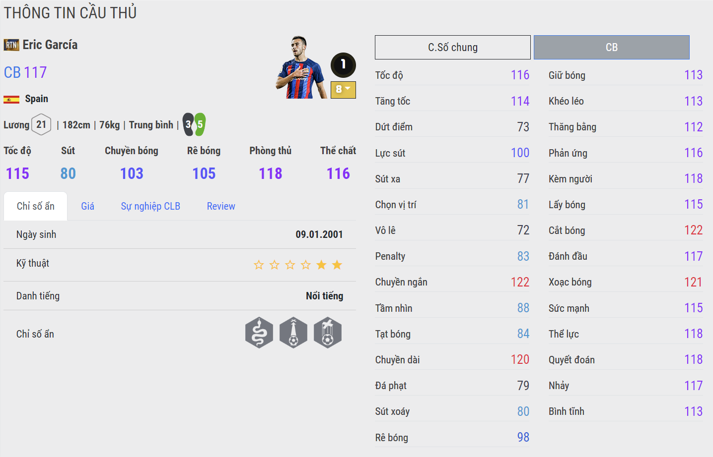 Garcia phiên bản +8 được đánh giá là một phiên bản rất đáng quan tâm cho vị trí trung vệ của Barcelona. Cầu thủ người TBN sở hữu tốc độ rất tốt, khả năng đua tốc, di chuyển pressing khi phòng ngự là rất nhanh và hiệu quả.