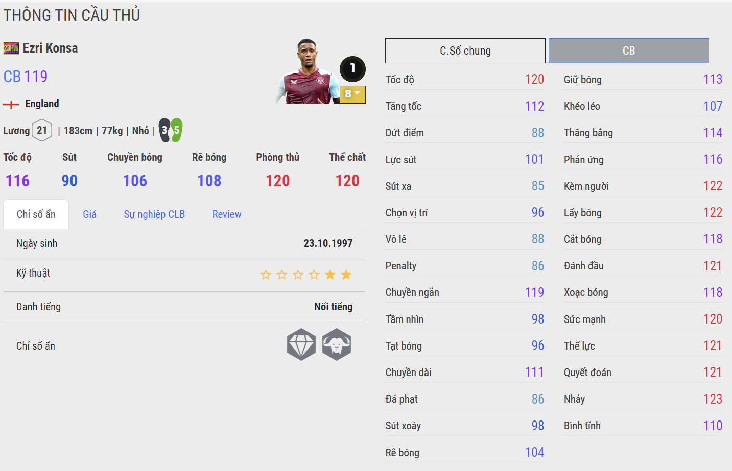 Chiều cao chỉ 1m83 nhưng Konsa có lối đá khá giống những Thiago Silva hay Sergio Ramos ở khả năng không chiến. Sức bật tốt, AI chọn vị trí thông minh và chính xác khiến cho anh phòng ngự bóng bổng vẫn rất ổn và cho thấy hiệu quả cao.