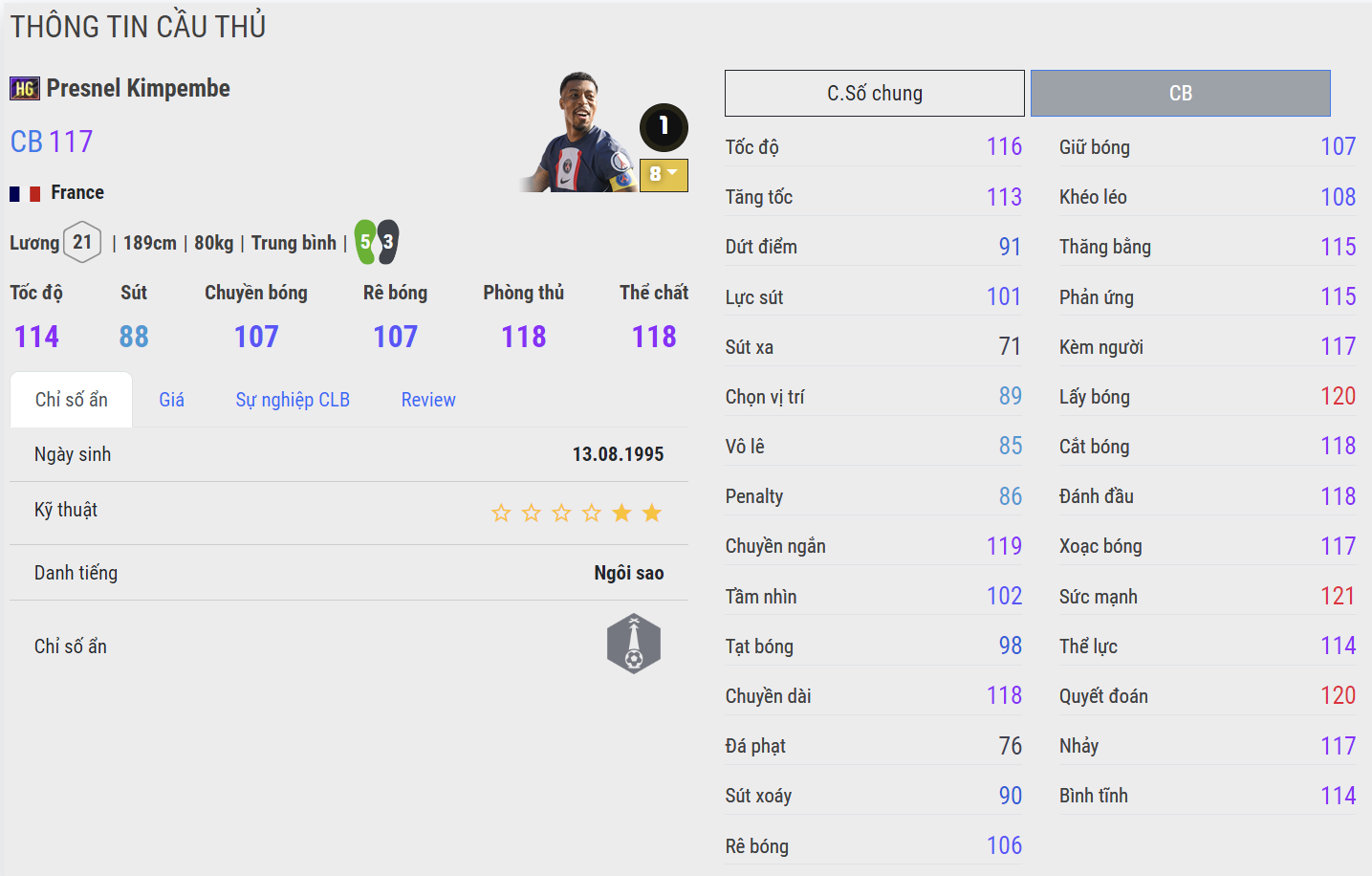 Kimpembe mùa thẻ HG được đánh giá là một trong những cầu thủ phòng ngự có tốc độ tốt, bộ kỹ năng di chuyển nhanh nhẹn và hiệu quả. Khả năng đeo bám rát cùng tốc độ áp sát nhanh phù hợp cho meta pressing hiện tại.