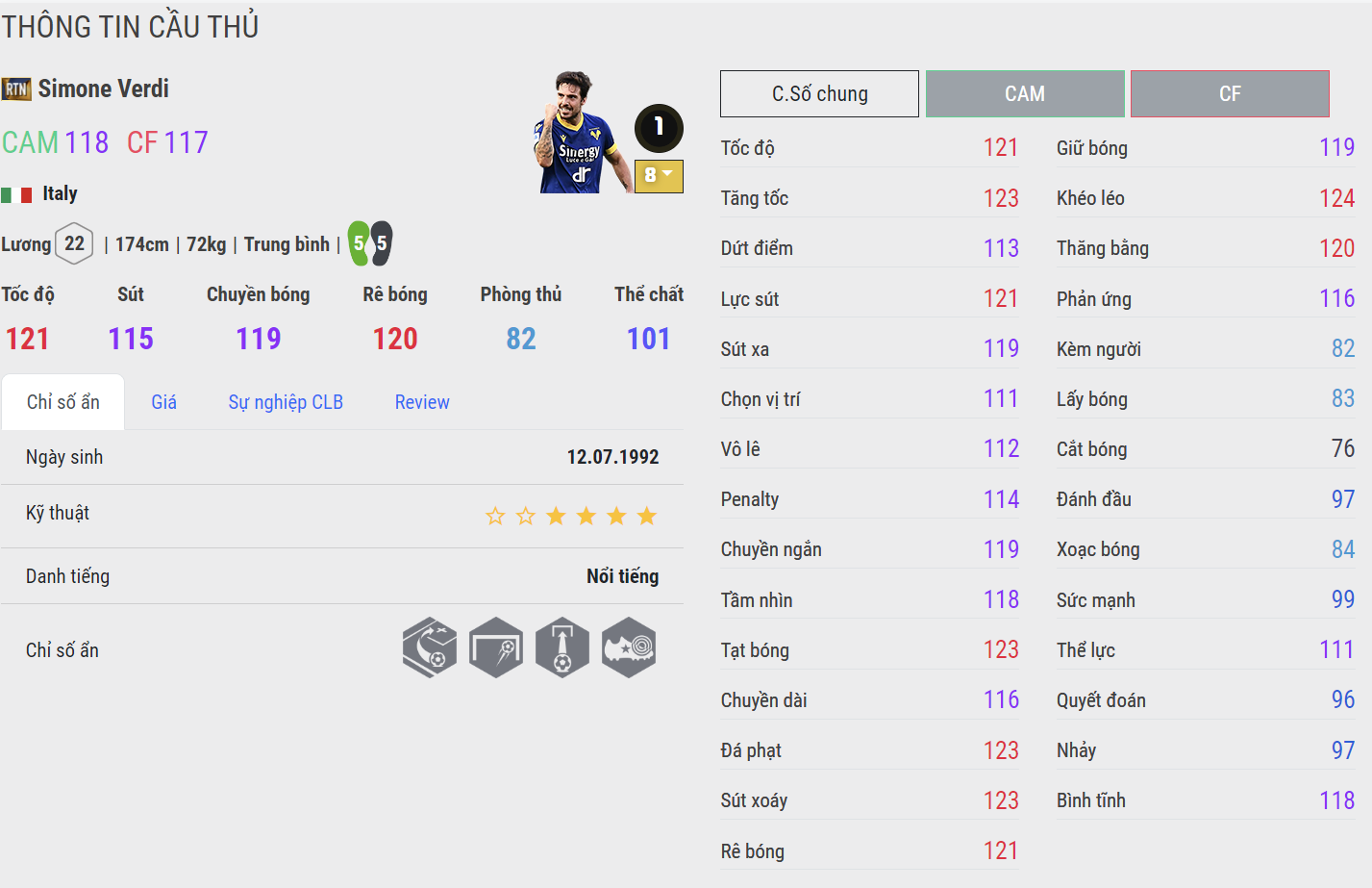 Verdi phiên bản RTN được coi là một trong những phiên bản thú vị, có giá trị sử dụng cao và hiệu quả cho team color Napoli và ĐT Ý sau khi được nâng cấp lên +8. Sở hữu tốc độ và khả năng bứt tốc tốt, tiền vệ người Ý có thể thi đấu tốt cả ở vai trò tiền vệ công, hộ công cho tới hành lang cánh.